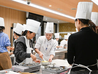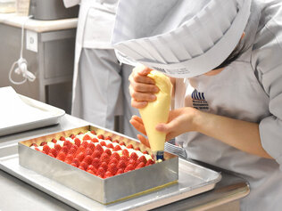 「圧倒的な実習時間」をこなす! 2年間を「プロの現場で求められる知見や技術をいち早く、しっかり身につける」ための選択と集中に費やす。東京製菓学校は、プロの仕事の現場と同じように、洋菓子・和菓子・パンの各ジャンルに特化した学科を設置。総授業時間のほとんどを占める実習で「たくさんつくる」「いろいろつくる」「すばやくつくる」を徹底し、どこよりも広く、そして深く掘り下げた専門的な実習ができることで、技術を身体で覚えることができます。