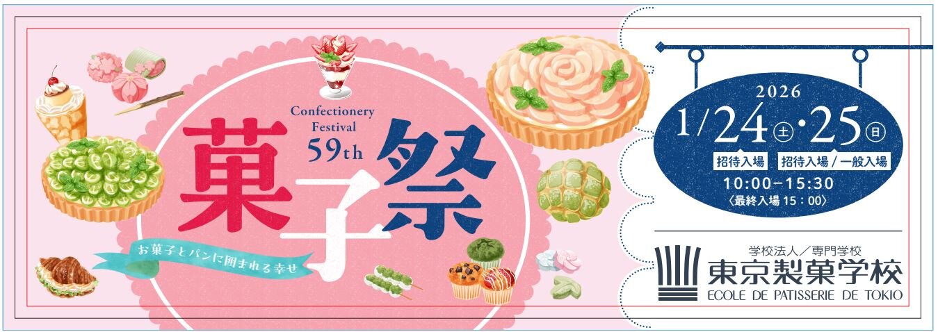 たくさんのお菓子とパンに囲まれる東京製菓学校最大のオープンイベント「第59回 菓子祭」を、2026年1月24日(土)・25日(日)の2日間にわたって開催します。
