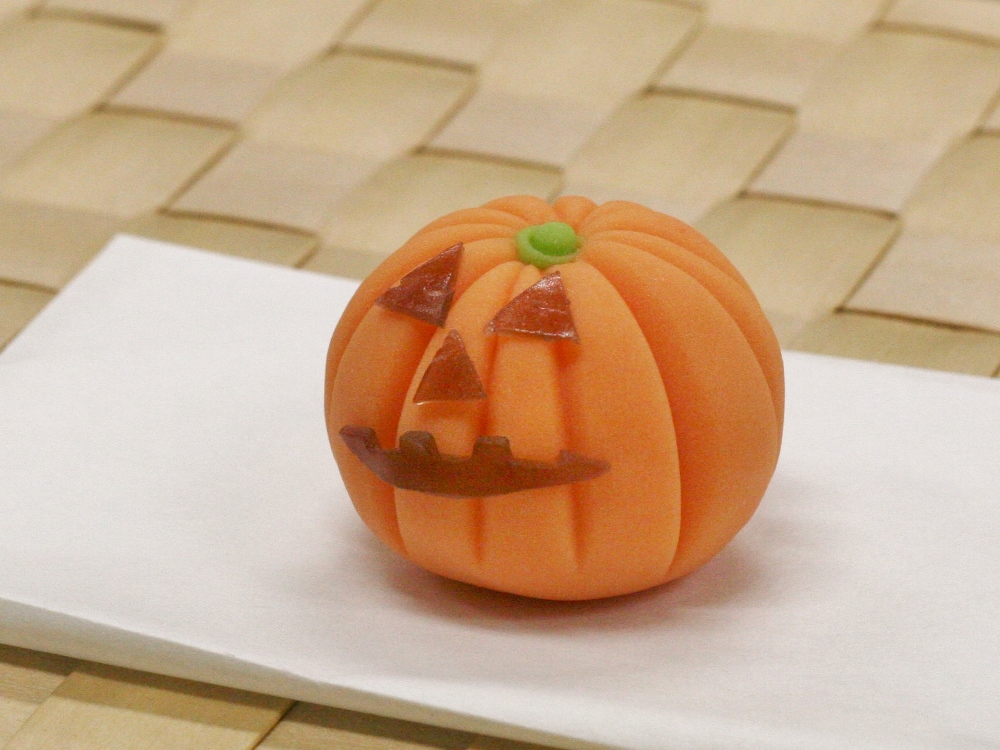 和菓子コースは練切餡で形取って目や口を羊羹で仕上げる「ジャック・オ・ランタン」です!ハロウィンっぽく、かわいらしく出来てますよね?!