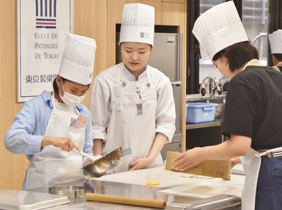 メインとなる体験実習では、洋菓子・和菓子・パン、各コースともに専任の先生と学生のアシスタントが、普段の授業と同じように今日つくる製品の説明をしてから、ポイントをおさえながら実演して教えていきます。