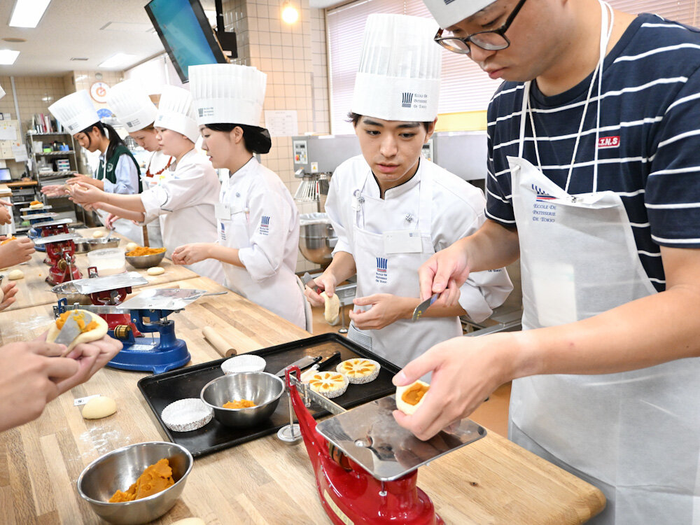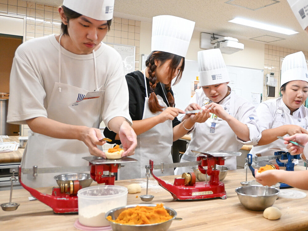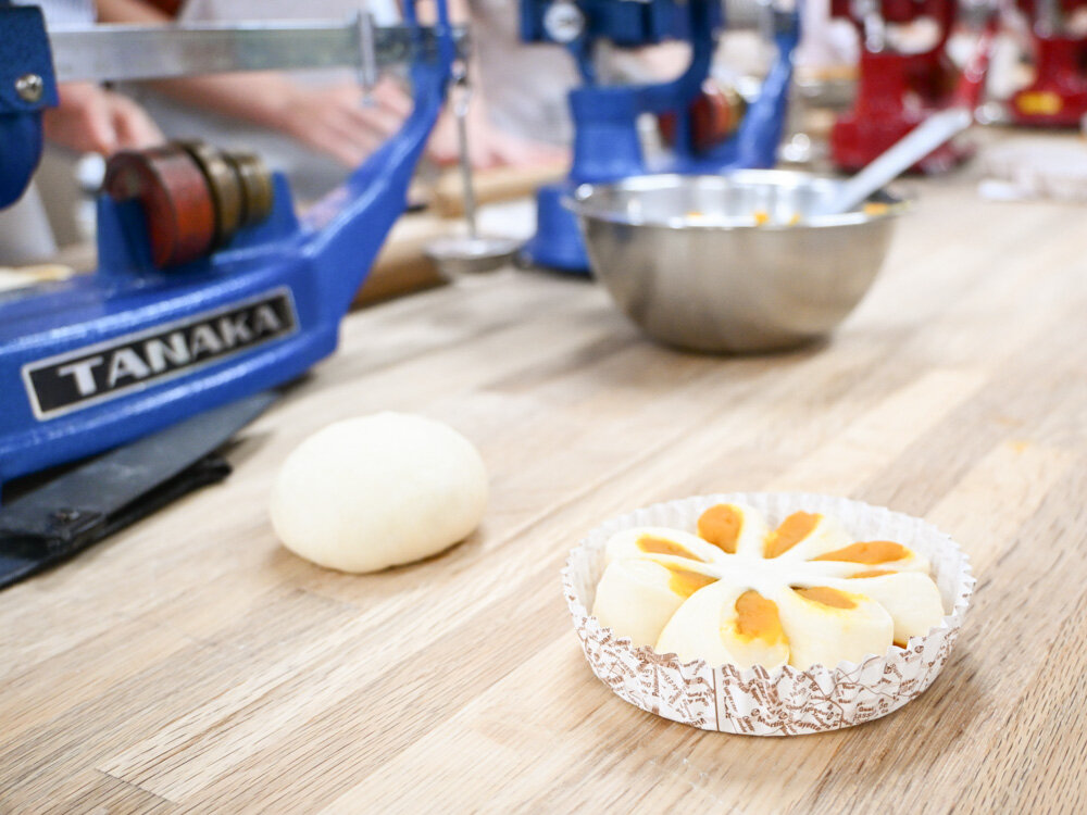 パンコースでつくっていただいたのは、秋の味覚の代表格である栗とかぼちゃが味わえる菓子パンです。実はこのかぼちゃあんぱんは、まだ今日のアシスタントの学生たちもやったことのない成形だったんですよ。