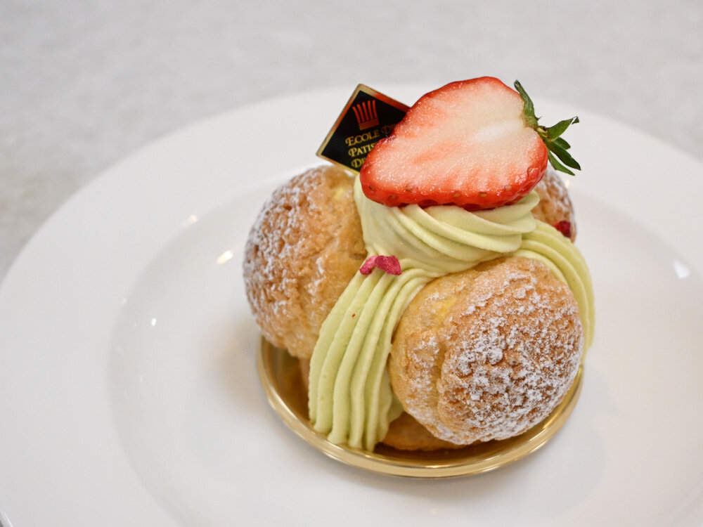 洋菓子コースでは、春色で華やかに仕上げる「ピスタチオとベリーのシュー」にチャレンジしていただいています。サクサク食感のクッキーシューに、相性ピッタリのピスタチオとベリーを合わせた春ならではのプチガトーです。
