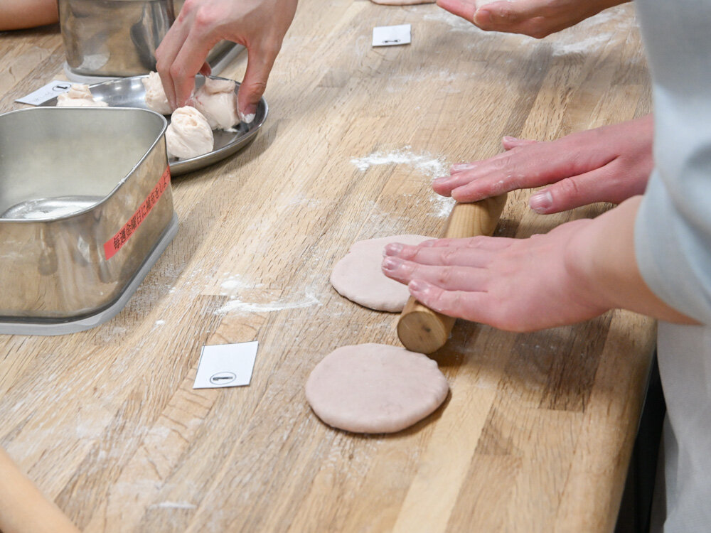 和菓子コースも焼き皮でつくる関東風のさくら餅を、パンコースもいちご味のクリームチーズを包む春色ロールを、いずれのコースも粉や水を合わせて生地をつくるところから体験してもらっています。