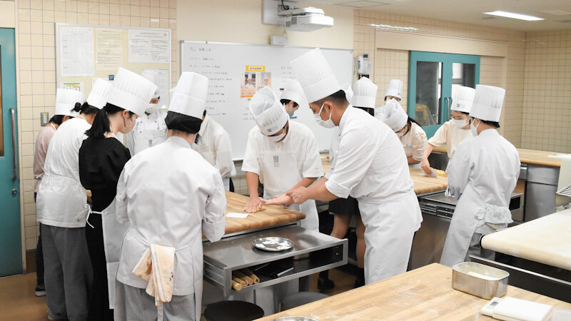 パンは好きでも、つくったことはないという方も多いかと思います。この体験実習では、本校パン科の学生がサポートしながら一緒につくっていきますので、安心して楽しんでくださいね。パンコースでは学生のアシスタントたちが、ほとんどの作業のお手本も見せてくれますので、専門的に学んだ学生がどれだけできるようになるのかもチェックしていってくださいね。