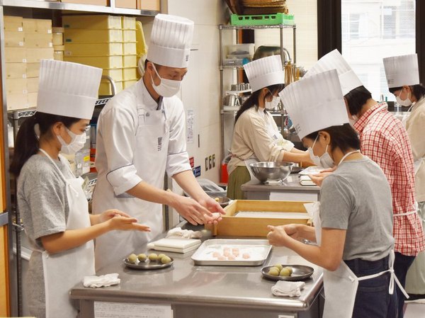 大事なものを中へ中へと包み込んでいく和菓子の包餡作業。今日の和菓子コースのみなさんは、担当した森崎先生もビックリするくらい包餡作業がとっても上手でした。手の熱がお菓子に伝わってしまわないように、短時間で手早くキレイに仕上げていくことはとっても大切です。