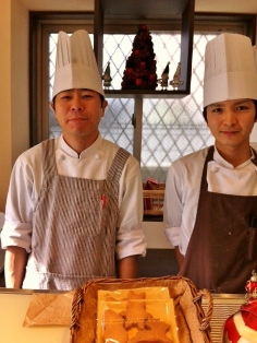 こちらのシェフは、本校卒業生の 遠藤 順史 さん。(左、洋菓子本科2001年卒)