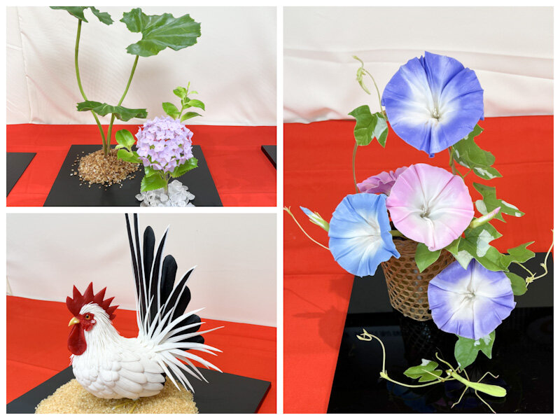 関連企業による新素材や新商品の出展や、役員を務める方々の作品展示もあり、繊細な技術が凝縮された工芸菓子をはじめ、上生菓子や干菓子、半生菓子など数多くの力作が一堂に展示されていました。