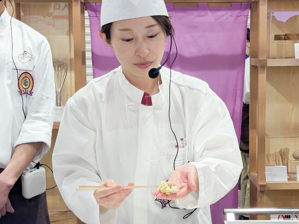 期間中は本校卒業生 中宮 千里さん(第1部和菓子本科2009年卒)、松野 友美 さん(写真中央:第2部和菓子専科2014年卒)、野田 大晴 さん(第1部和菓子本科2018年卒)が交代しながら特設ブース内で、実演&菓子配布を行なってくれるようです。