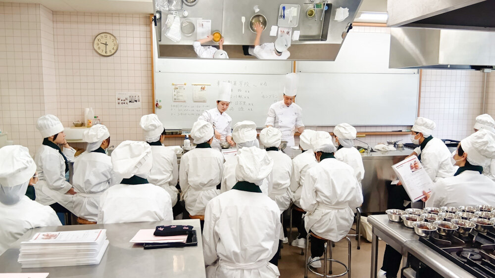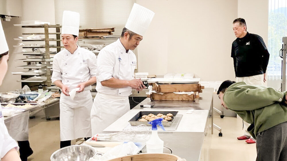 今回は和菓子科 長谷川 献 先生と洋菓子科 谷藤 拓 先生、そして助手として山形県出身の洋菓子科 村井 日万里 先生を派遣し、秋の味覚をつかった蒸し羊羹や洋素材を用いたヌーヴェル和菓子、ほうじ茶や餡といった和素材を用いた洋菓子など、計6品の講習会を実施してきました。