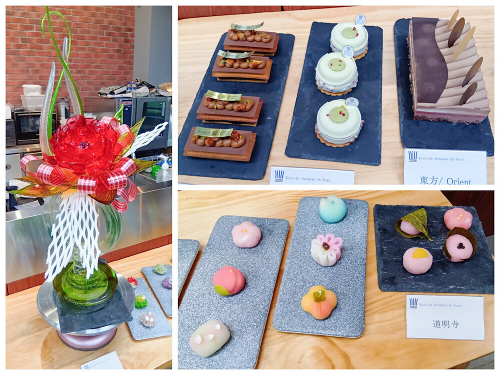 洋菓子科 谷藤 先生考案の生菓子スペシャリテ3品と、得意とするアメ細工のデモンストレーションとともに、和菓子科 長谷川 先生にはベーシックな外郎と道明寺の2ジャンルを披露してきました。