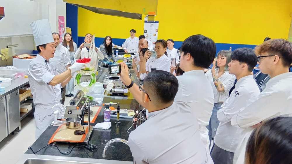 そして今回は11/12(水)には台中、11/13(木)には高雄へと場所を移して、台湾支部長の陳 世育さん(Chen Antony、第1部洋菓子本科2009年卒)が客員教授を務めている現地の大学からの要請に応えるかたちで、大学生たちに向けてのアメ細工と季節の上生菓子のデモンストレーションと実習も行なってきました。