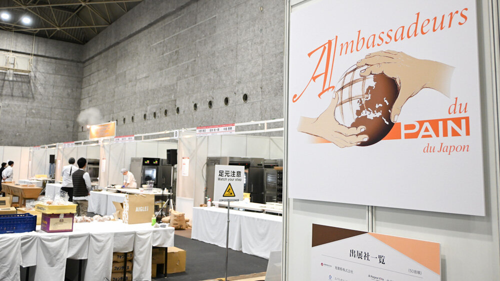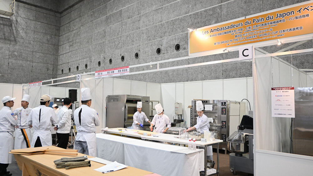 競技は前日11/25(火)の事前準備日を経て 、翌26(水)に各個人それぞれ6時間にわたって行われました。 会場は「FABEX関西2025」のイベントスペース内、偶然にも本校在学生の3名は同じブース内で作業を行なうことに。プロのパン職人の方々をはじめ、一般の方もたくさん来場されて注目されている中で、3名の在学生たちは集中力を切らすことなく、黙々とそれぞれのパンづくりに取り組んでいました。