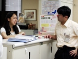 学生たちが列をなして、就職課スタッフのところに来ています。