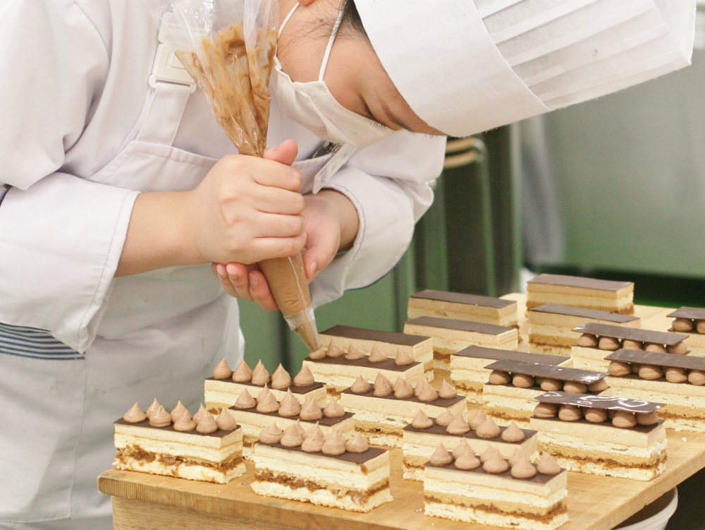 洋菓子本科では、2年生になると朝から夕方まで一日通して、ムースケーキやタルト、焼き菓子など、さまざまな製品を数種類同時進行でつくっていくこともあります。