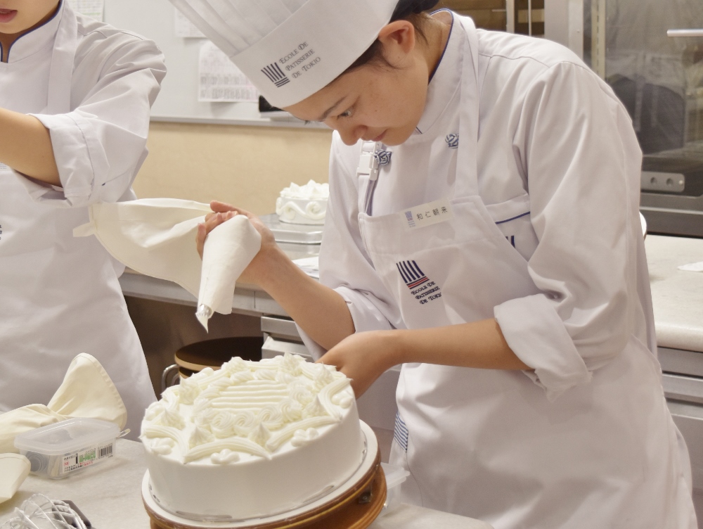 中でも、お菓子の表面にクリームを塗る作業である「ナッペ」や、デコレーションに欠かせない絞りの技術「パイピング」の修得には、特に時間を割いて練習していきます。