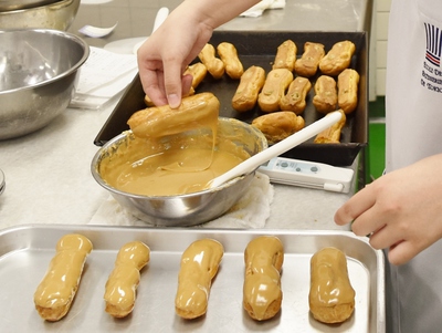 今回の授業で取り組んでいたのも、バターを多く使ったきめ細かいどっしりとした生地や、おなじみのマドレーヌ、シュー製品のエクレアなど、ベーシックなレシピ。