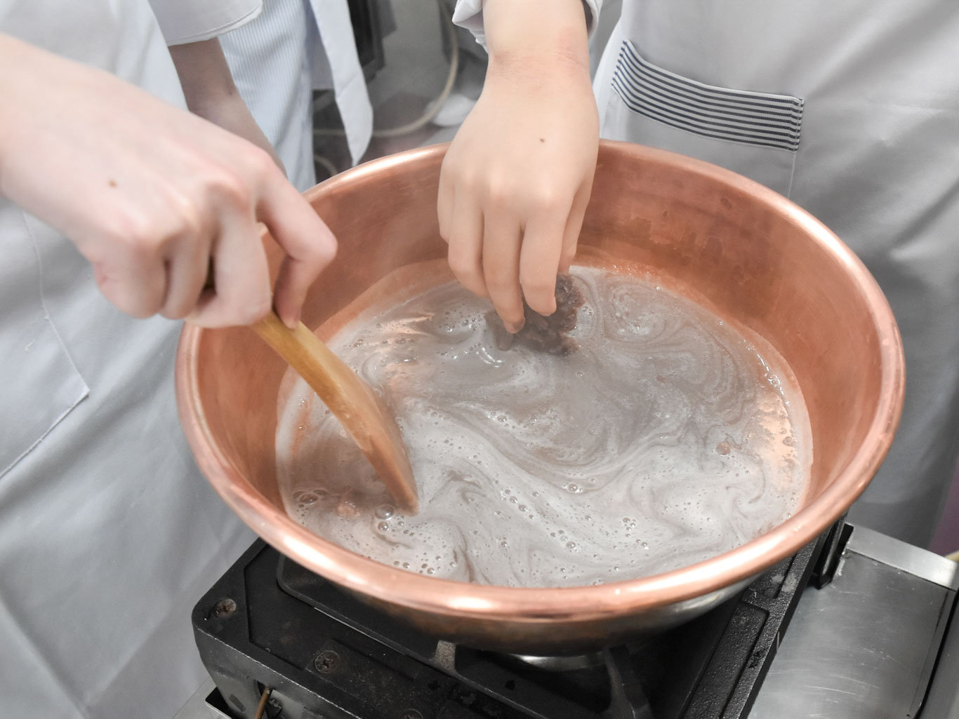 寒天や水、塩といった材料の役割や効果、それらを加えていく順序や混ぜ方といった細かな点についても触れながら、デモンストレーションでしっかりと解説してからつくっていきます。