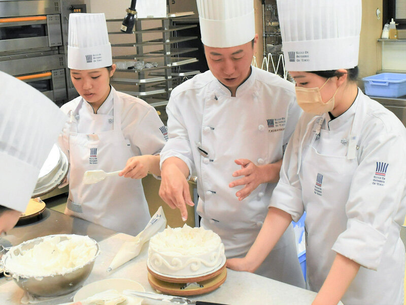 昼間部 洋菓子本科1年生では、このナッペやパイピングの練習を行なう時間を、授業時間内にしっかりと設けて取り組んでいます。