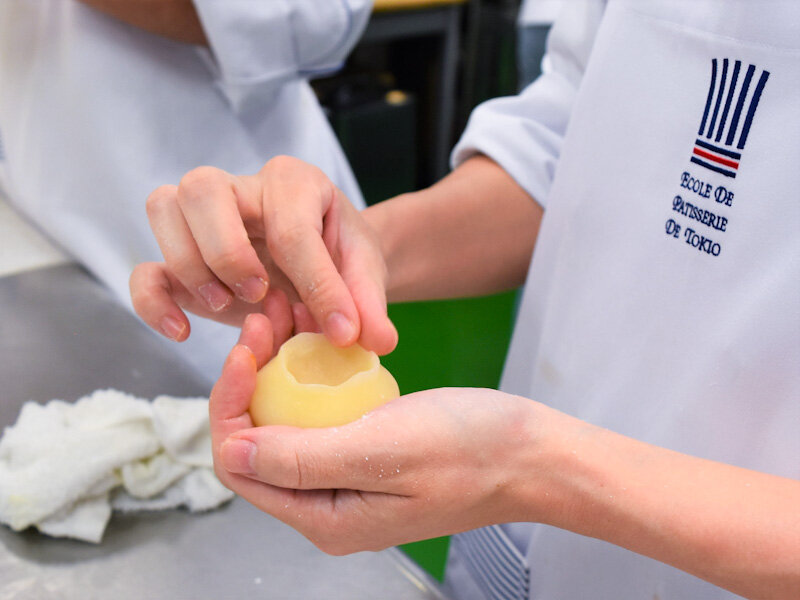 先日の夜間部 和菓子専科2年生が実習でつくっていたのは、外郎生地でつくる上生菓子「金魚鉢」。涼しげなデザインに合わせて、中餡にはオレンジの皮と果汁をたっぷりと加えて、さっぱりとした味わいに仕上げたオレンジ餡を使用しています。