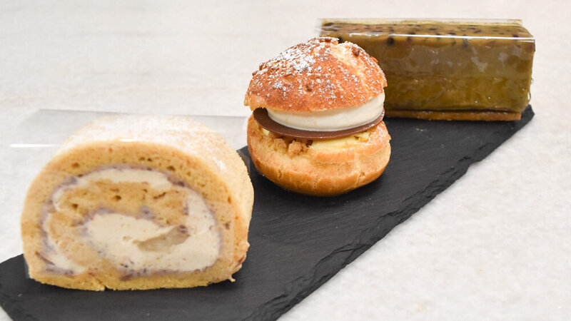 求肥とどら餡を黄な粉のシャンティーと黄な粉のビスキュイで巻いたロールケーキ、ほうじ茶のサブレとテリーヌにどら餡生地を合わせたほうじ茶のバトン、ムスリーヌとシャンティーのWクリームにどら餡とシュトロイゼルを合わせたシューです!