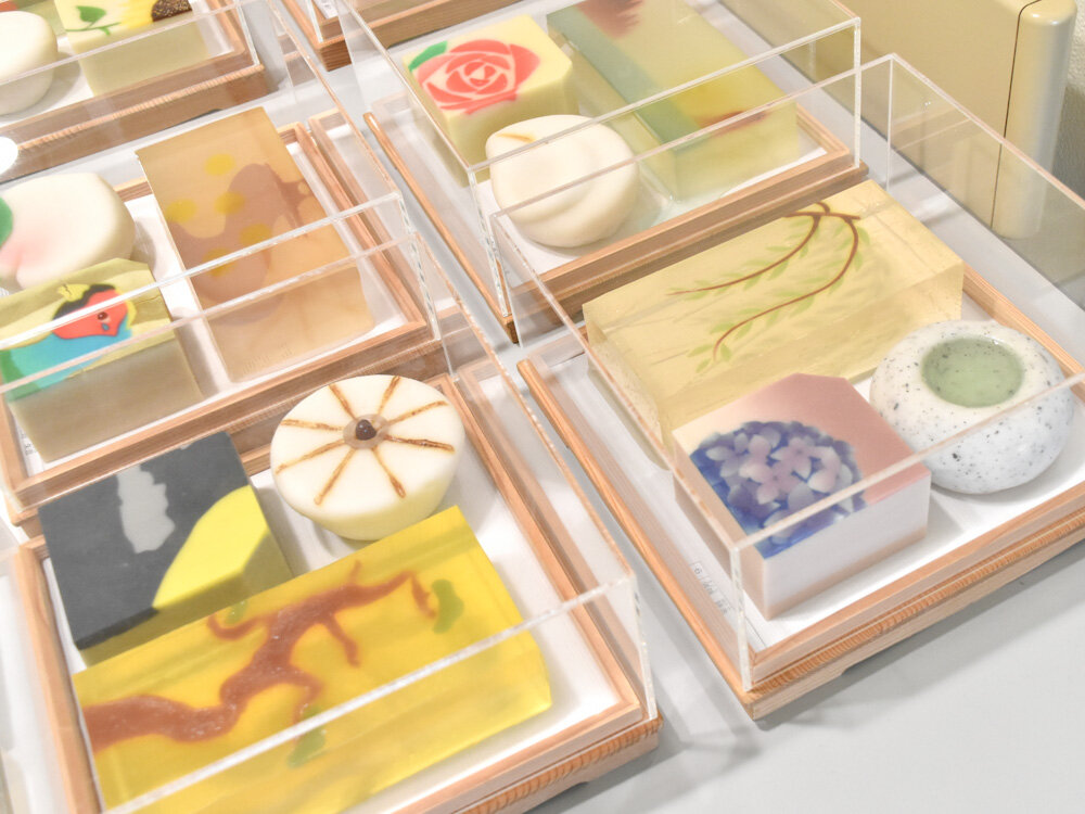 学生それぞれにテーマを設定して、練切や羊羹、雪平、外郎、こなしなどを用いて、より手の込んだ作品づくりに取り組んでもらいました。元々が冠婚葬祭時につかわれるお菓子ということもあり、割り切れないようにという縁起を担いで数は奇数でつくり、素材やカタチ、色合いを変えて組み合わせていきます。
