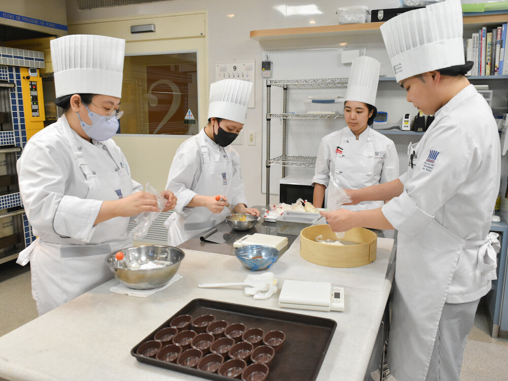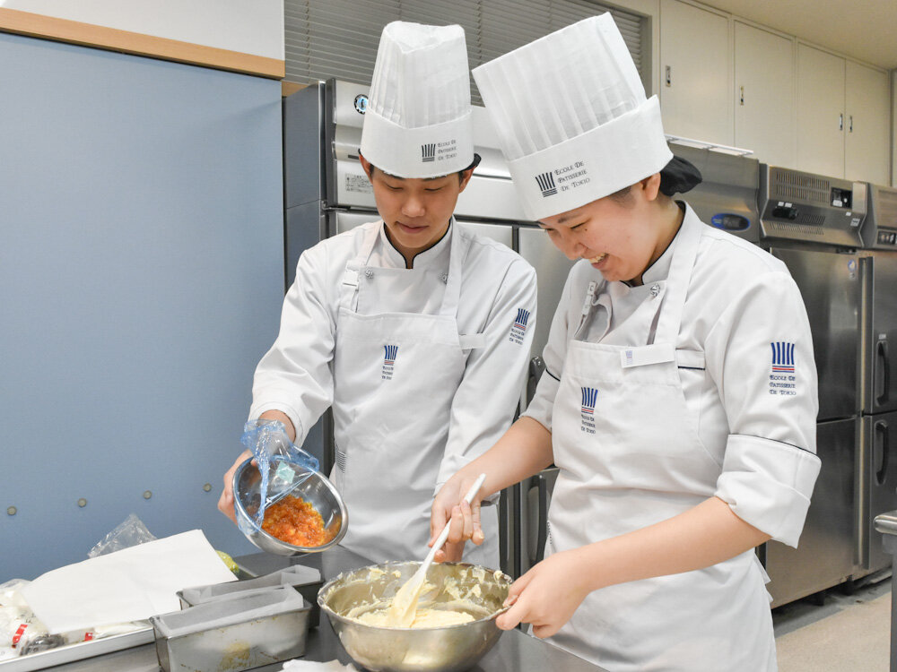和菓子を専門的に2年間学ぶ学科ですが、洋菓子ならではの生地づくりを学んで、今後の新しい和菓子づくりに活かしていってもらうために、和菓子とともに洋菓子の勉強も行なっているんですよ。