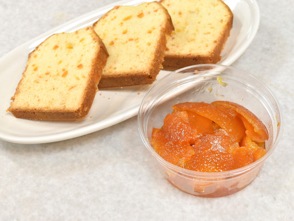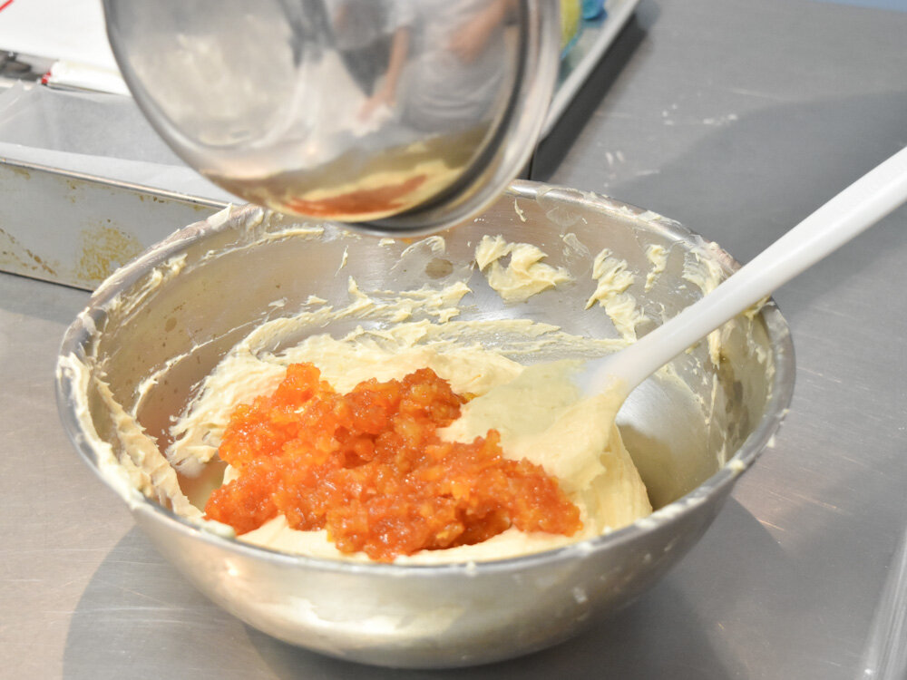 その中でパウンドケーキに使用していたのは、夏前の授業で昼間部 洋菓子本科1年生が仕込んでおいたオレンジコンフィです。フレッシュなオレンジをつかった製品をつくった際に残ったオレンジの皮を、シロップで炊いてつくったものを使用していきます。