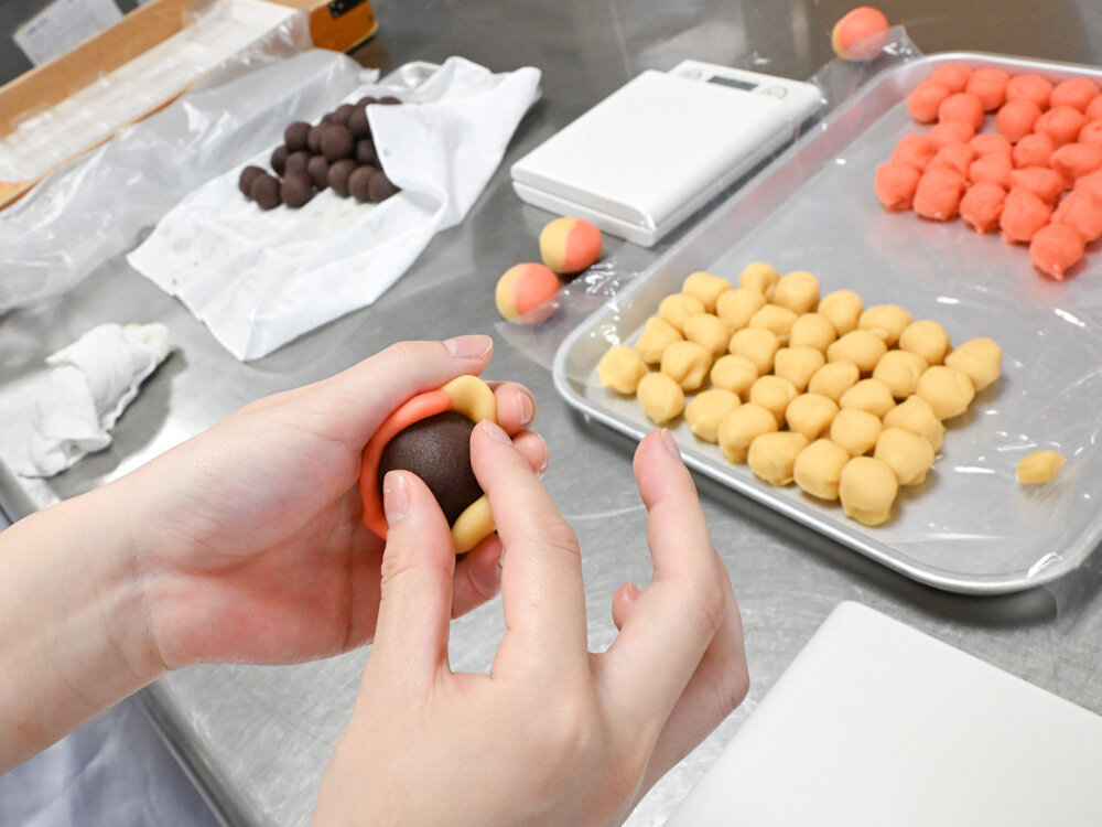 錦秋とは、野山が紅葉が錦の織物のように彩られた美しい秋の様子を表しています。ちょうどその名の通り「秋彩」と菓銘がつけられた、右上に配置してある栗餡と小豆餡をこなし生地で包んで仕上げる製品に取り組んでいました。