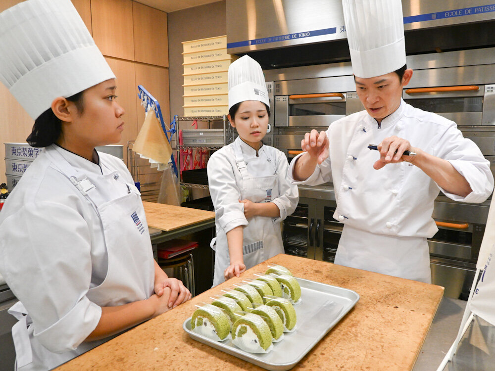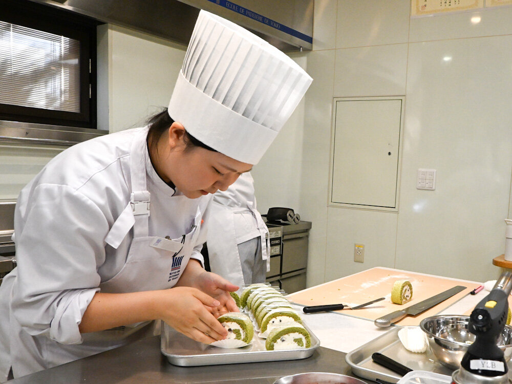 今日の昼間部 洋菓子本科1年生でつくっていたのは、抹茶のロールケーキ「ルーロー・オ・テヴェール」です。シンプルなものからアレンジしたものまで、ロールケーキだけを見ても、いろんなバリエーションがありますよね。どういった食感で、どんな味わいを楽しんでもらいたいのか。それによってレシピも製法もさまざまあるんです。