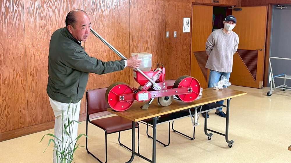 毎年お世話になっている地元農家の若菜さんにご協力いただき、まずは近所の公民館でのレクチャーからスタート。国産小麦の基礎知識や品種の特徴、種を蒔く際の注意点などを教えていただいてから、いざ畑へ。