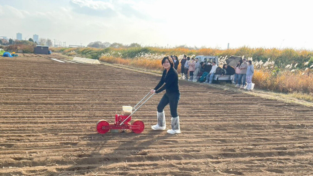 若菜さんが事前に準備してくださった美しい畝(うね)に沿って、みんなで交代しながら丁寧に種を蒔いていきます。 極力真っ直ぐに、そして適切な間隔で蒔いていく作業は、簡単なようでいて集中力が必要です。