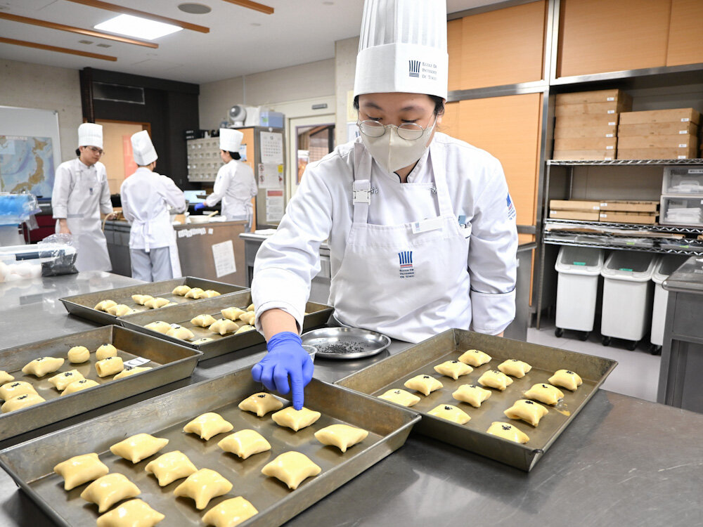 先日の昼間部 和菓子本科1年生がつくっていたのは、さつま芋餡を包んで焼き上げる「パイ饅頭」です。