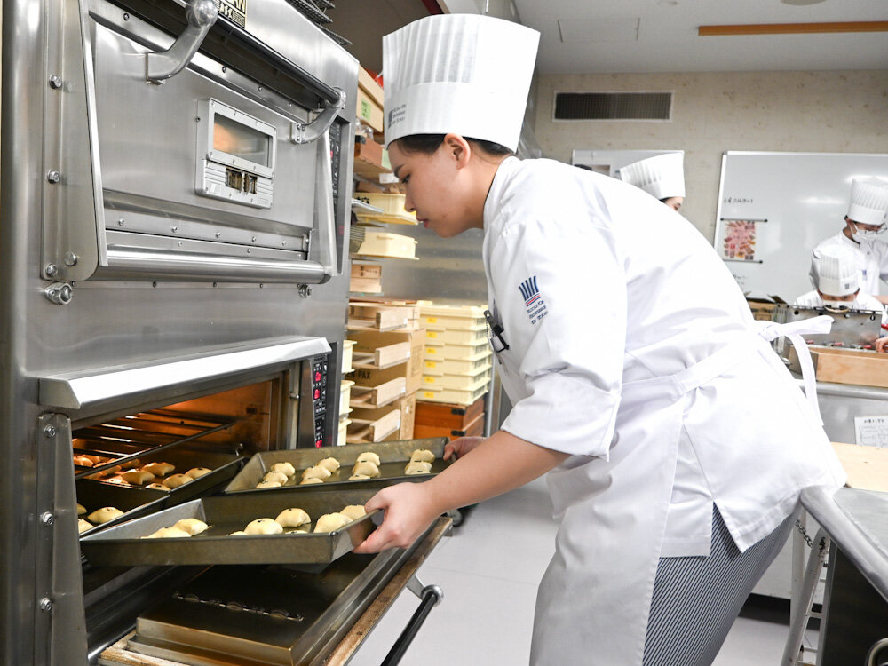 素材や生地の組み合わせ方や取り入れ方も学んでもらうために、和菓子科ではこういった洋風仕立てのお菓子もたくさんバリエーションをつくっていくんですよ。古くから愛されているお菓子ももちろん大切ですが、多様化が進む現代においては新しい視点でのお菓子づくりも大事ですよね。