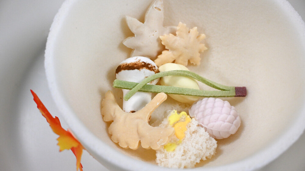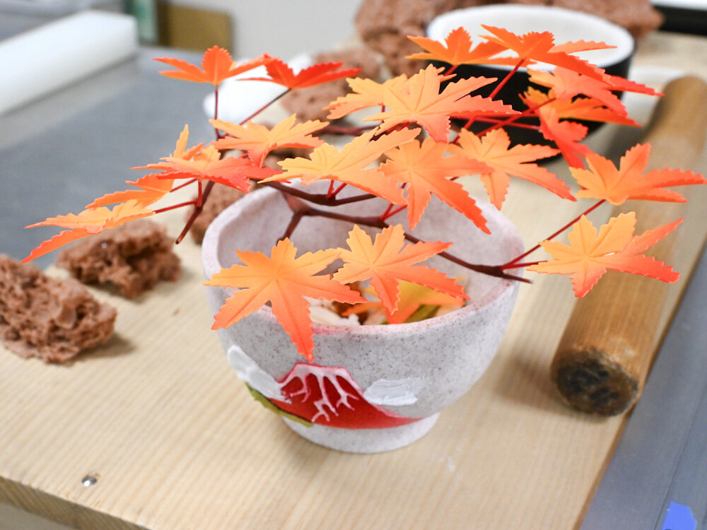 飾りとして添えた紅葉も、工芸菓子でつくられているものなんですよ。芸術性豊かに山水花鳥が表現された見事な出来栄えです。干菓子は秋をテーマに銀杏や松茸、松やイチョウの葉などを模してつくりました。
