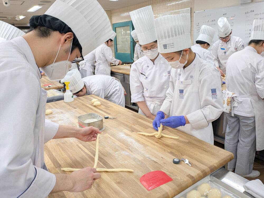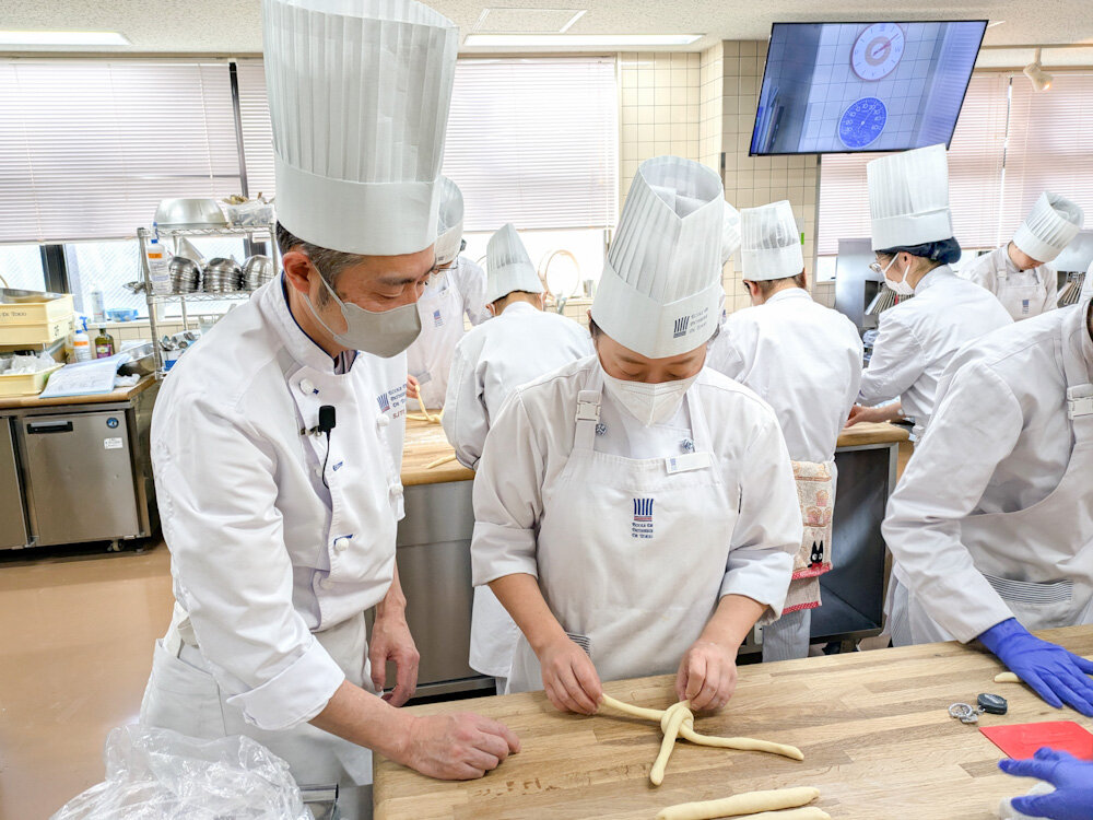昼間部 パン本科1年生が練習していたのは、パン職人の技術が問われる編みパンです。