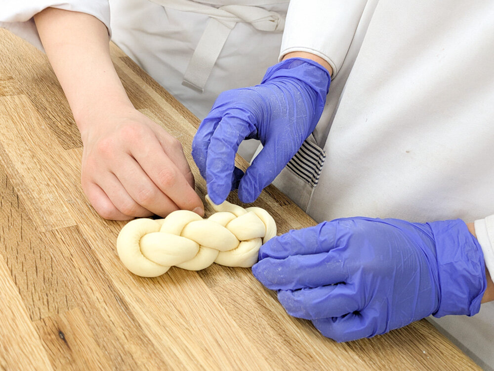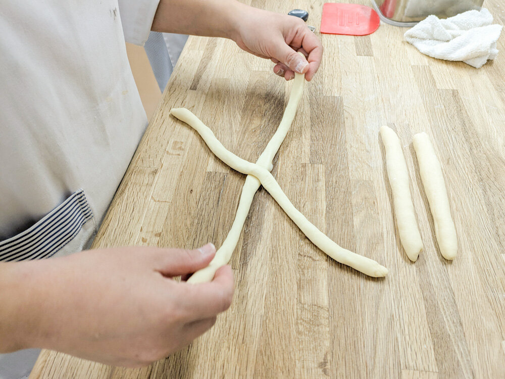 美しい見た目に仕上げるためには、正確な成形技術が求められます。発酵後の生地の膨らみを想定して、絶妙な力加減で編み込んでいかなければならないので難しいんです。