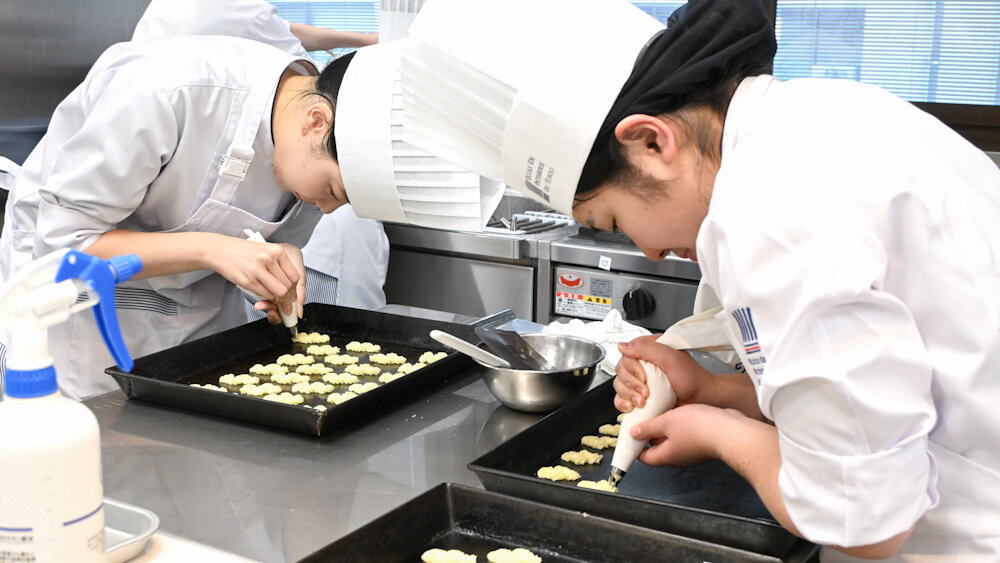 昼間部 洋菓子本科1年生の実習では、これまで学んだことの復習や再確認も行なえるように考えて、先生たちが実習品目を設定してくれています。今回取り組んでいた製品にも、基本中の基本である共立てスポンジ、パティシエには欠かせないクレーム・アングレーズ、クッキー生地など、以前にも何度か行なっている作業が随所に入っていました。