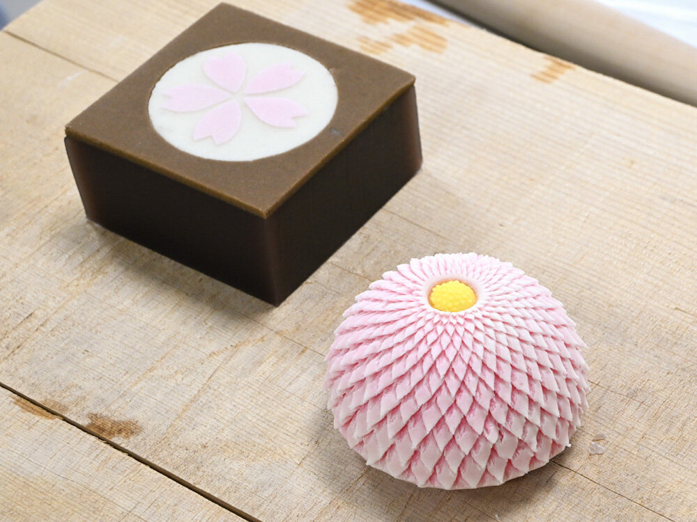今回学生たちがチャレンジしていたのは、小豆羊羹で扇の各部を寸法通りに包丁で加工して組み合わせていく「扇形羊羹包丁加工仕上げ」や、上生菓子の中でも特に高度で繊細な技術を要するものの一つである「はさみ菊」など、実際に手を動かして何度も練習していくことでしか自分のものにすることはできないものばかり。