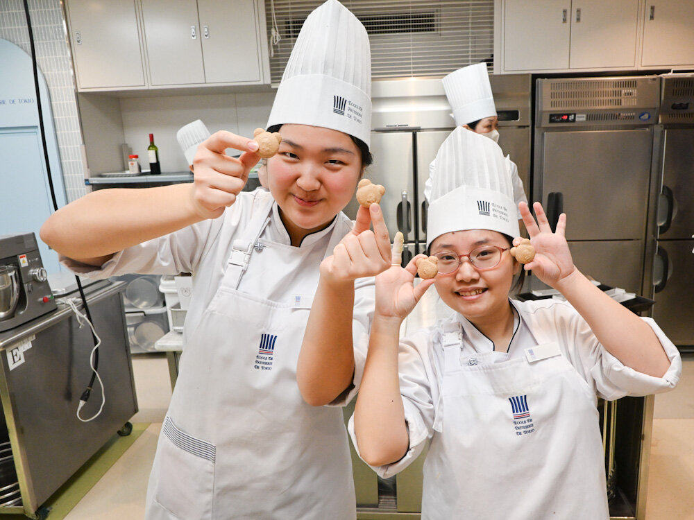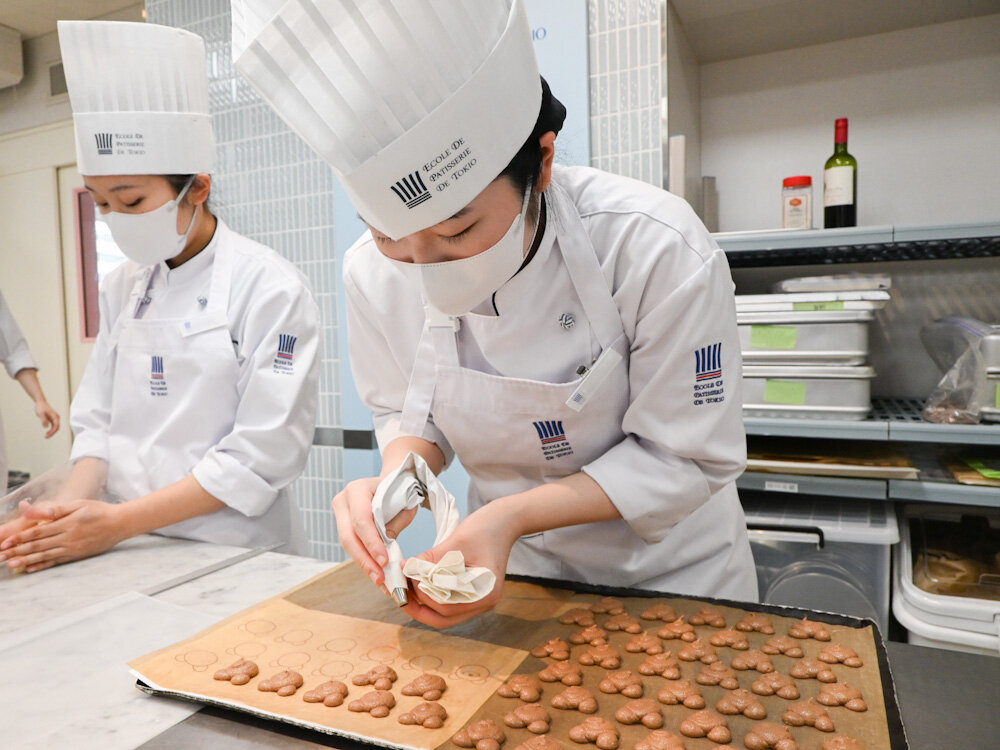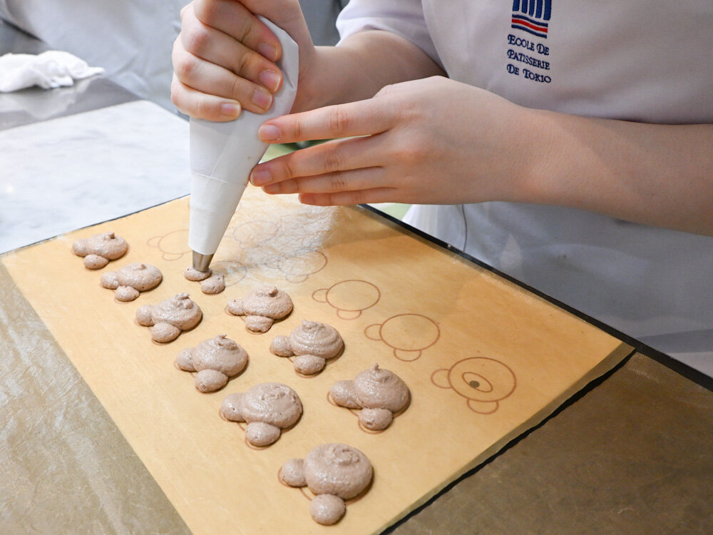 今日の昼間部 洋菓子本科1年生の実習でつくっていたのは、大人気のチョコレートのマカロン「Macaron chocolat」です!今回はくまのカタチに絞ってつくっていきます。