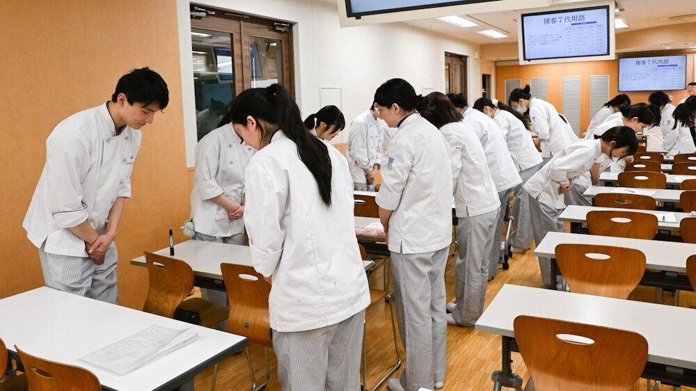 昼間部 洋菓子本科2年生では、お客さまに対してどのように振る舞うべきなのか、売る側の視点でお菓子についても考えられるよう、「接客販売」の授業も行なっています。