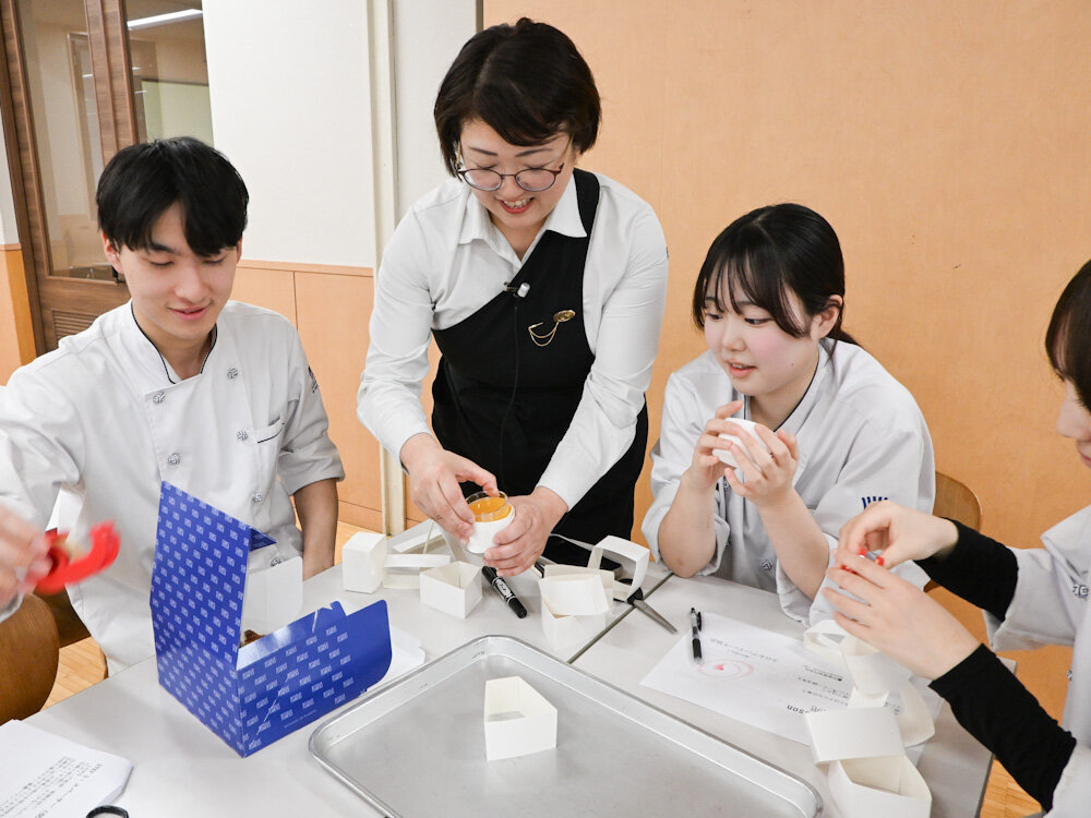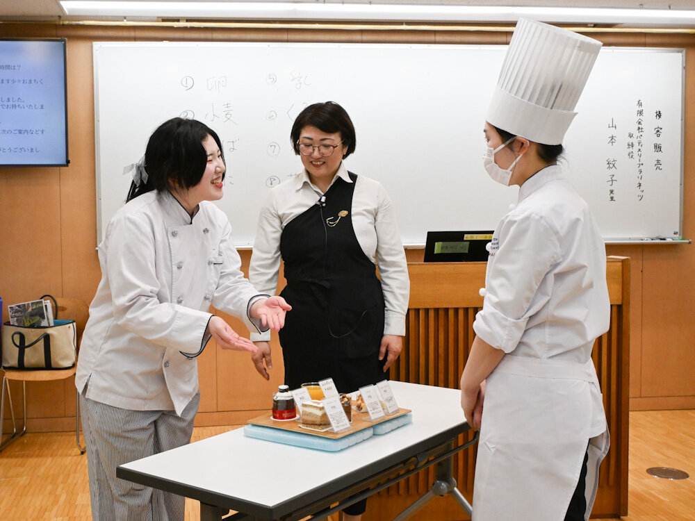 先日は講師として、東京・練馬にある人気店 パティスリー・プラネッツ の取締役 山本 紋子 先生にお越しいただき、パティスリーの販売とはどんな仕事なのかを、実践を交えて教えていただきました。