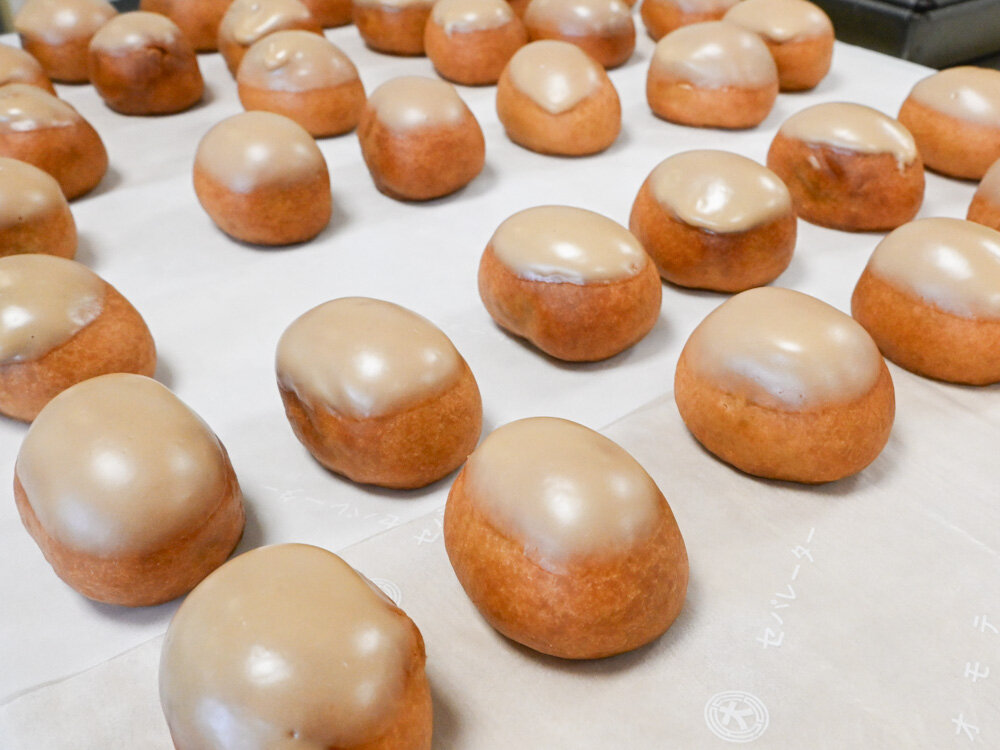 蒸して仕上げるもの、オーブンで焼成するものなど、数多くの種類が存在するお饅頭の中から今回つくっていたのは、油で揚げてから黒糖の摺り蜜を塗ってエクレアのような見た目に仕上げる「揚げ饅頭(かりんとう風)」と、でき上がりのちりめん状の表面で雪を表現した「吹雪饅頭」です。