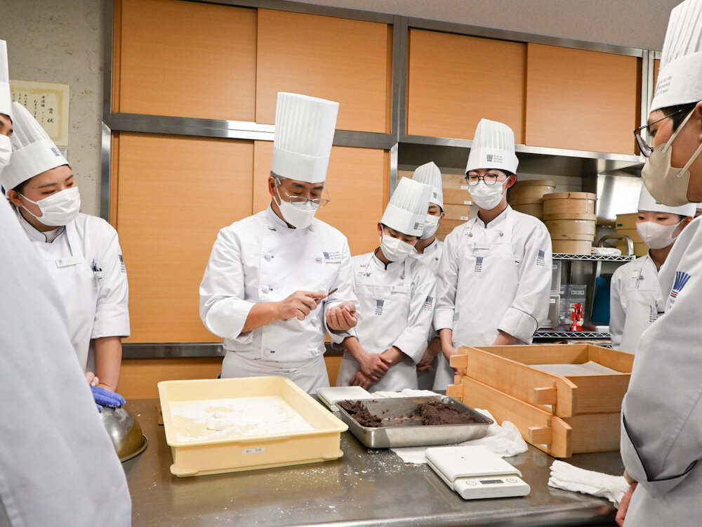 当然難しい作業にはなりますが、学生たちに目指してもらいたいのは、やはりプロの和菓子職人レベルの技術。先生にしっかりとポイントとなる部分やコツを教えてもらってから、学生たちにも順次トライしてもらいました。