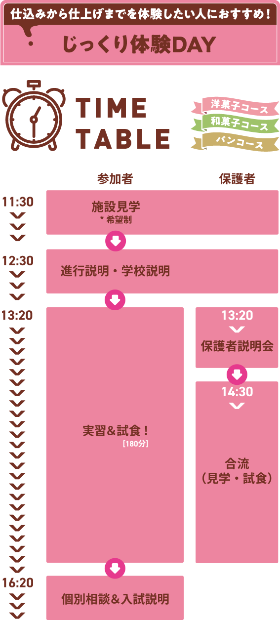 「たくさんつくる」「いろいろつくる」「すばやくつくる」「くり返しつくって失敗も経験する」。総授業時間の約84%を実習に割くという、超実践的カリキュラムが東京製菓学校の最大の特徴。国内トップクラスの充実した実習が、技術を身体で覚えることにつながります。